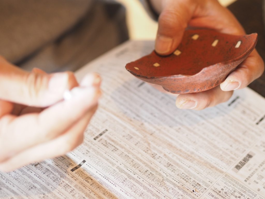家に帰って早速、作業開始。削り、接着、埋め、真鍮粉で塗装。なんちゃって金継ぎ(本漆ではない)で主人が直してくれた。
