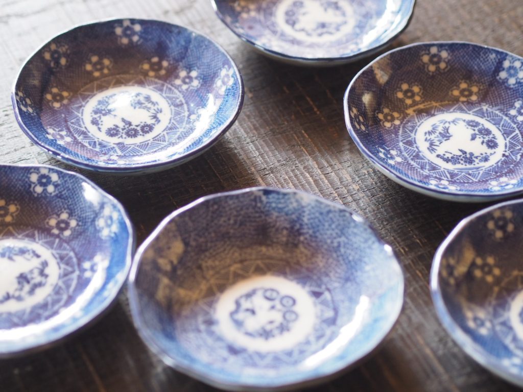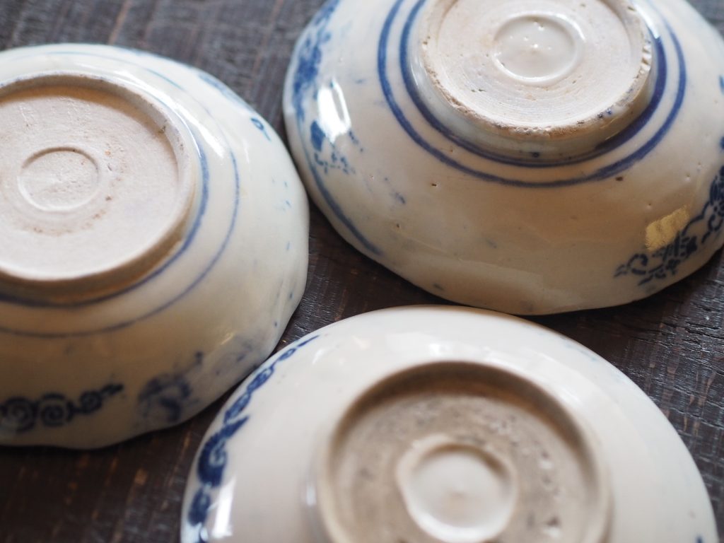 絵付けのまばらさと、高台の部分の歪み。使用していた年代もものを使う背景を感じる。大量生産であっても、ものづくりが一つ手仕事だった時代を、手に取るように感じて、置いた時に、若干傾きがあったり、微妙にぐらつく感じ、前に使った方の癖や、凹みもたまらない。
